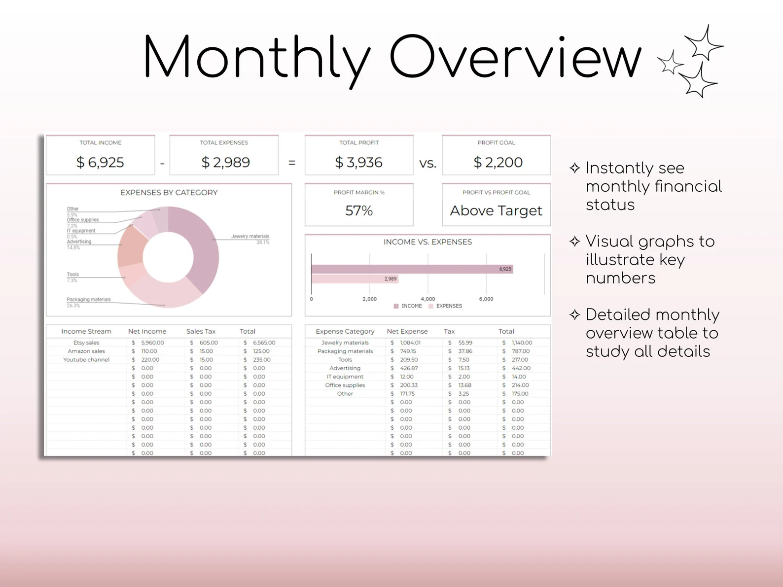 ✔ Monthly overview dashboard